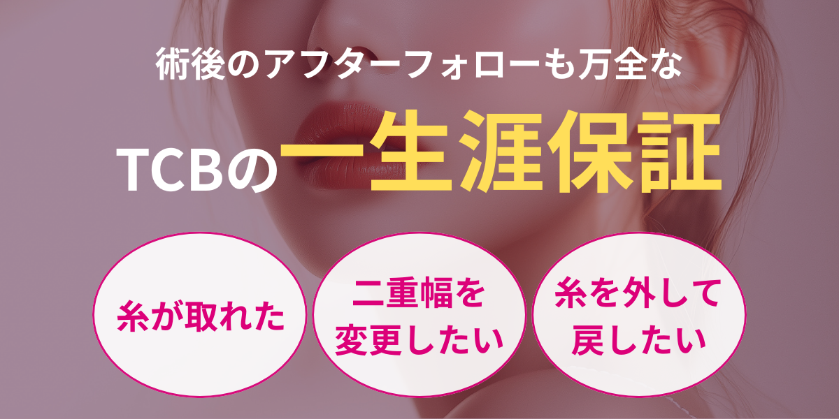 TCBの二重術では3つの保証が用意されています。「糸が取れてしまった」「二重幅を変更したくなった」「糸を外したくなった」といったことが起きてもアフタフォローが万全です。