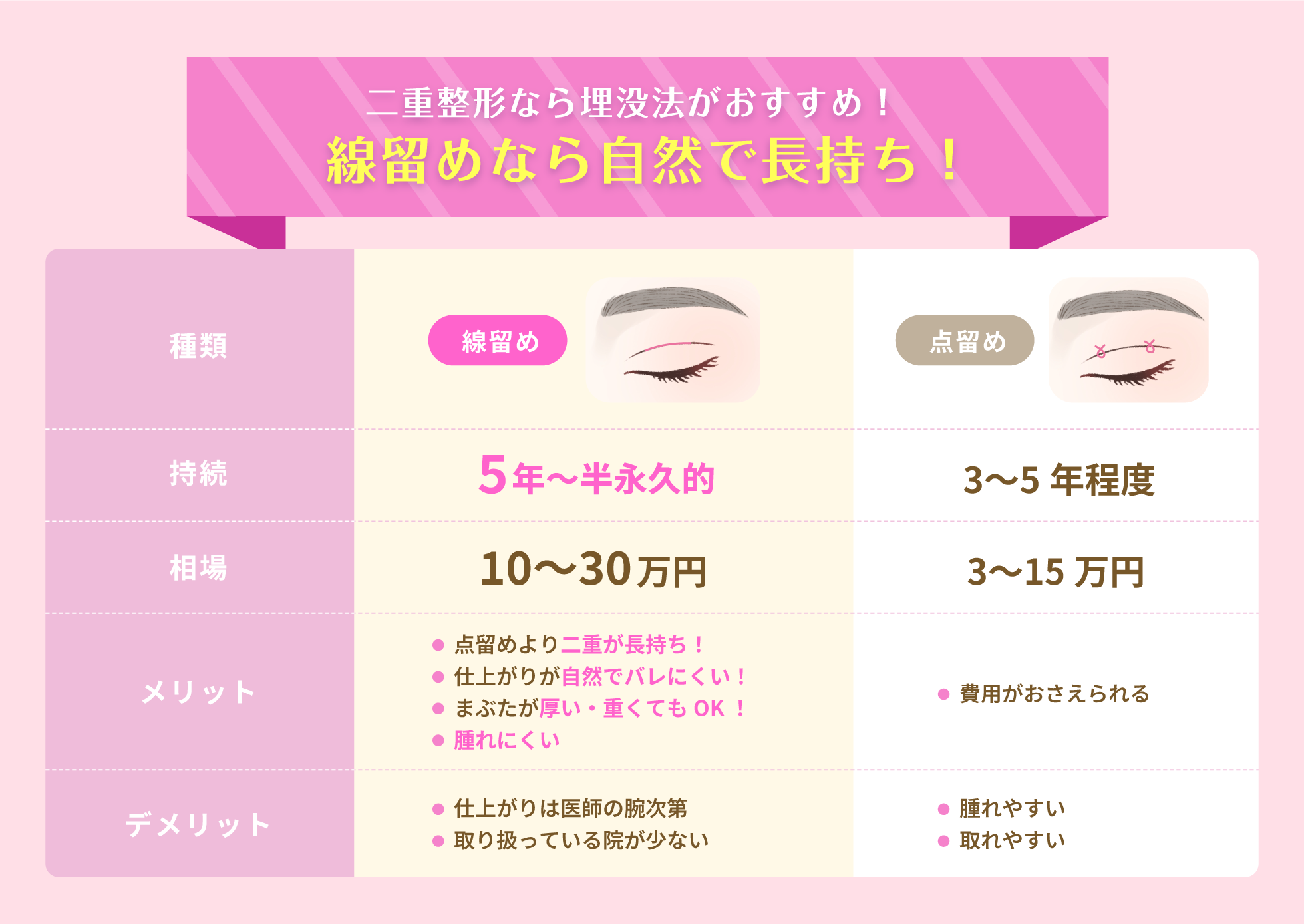 点でラインを固定する「点留め」と違い、埋没の中でも強度が強くラインが取れにくい傾向があります。